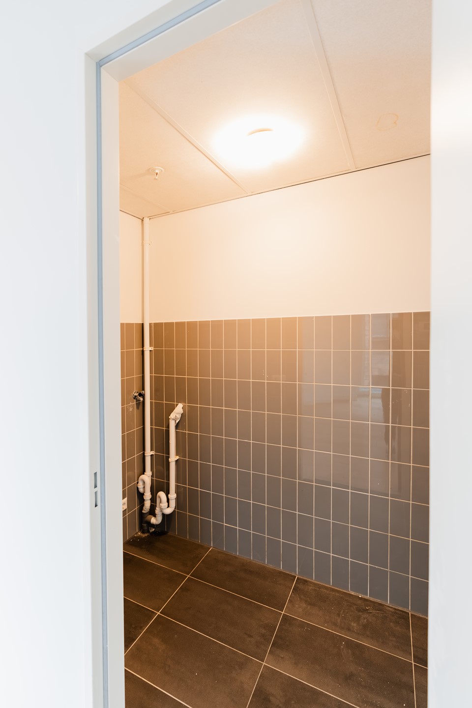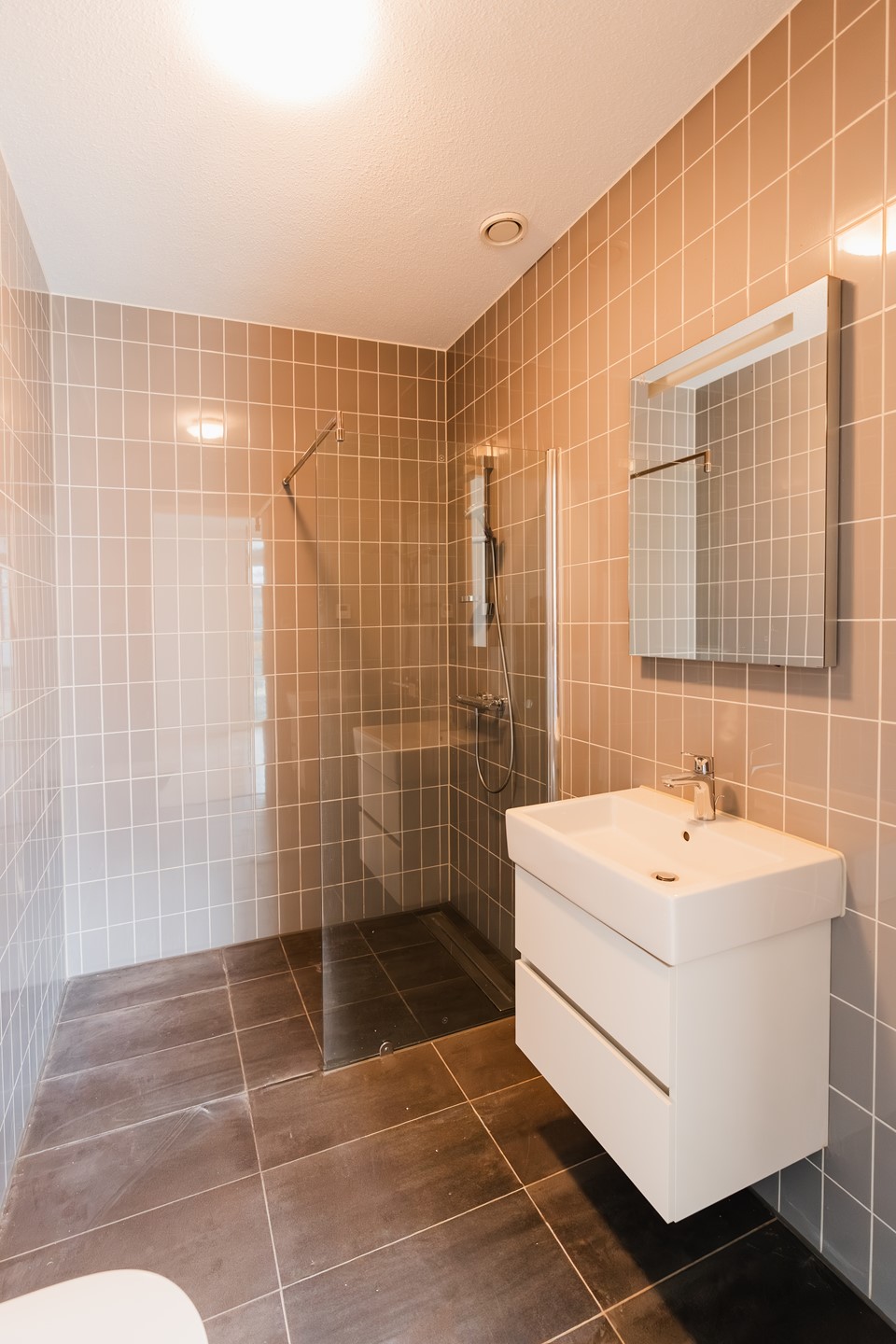 De badkamer, bereikbaar vanuit de slaapkamer, is stijlvol en rustig afgewerkt en beschikt over een inloopdouche, wastafelmeubel, handdoekradiator en een tweede toilet. Aangrenzend ligt een praktische was- en bergruimte met plaats voor wasmachine en droger.