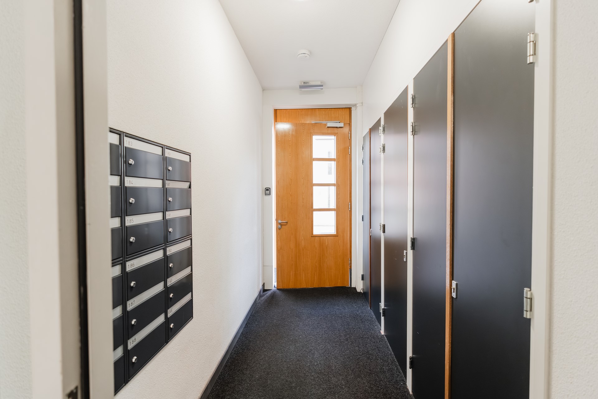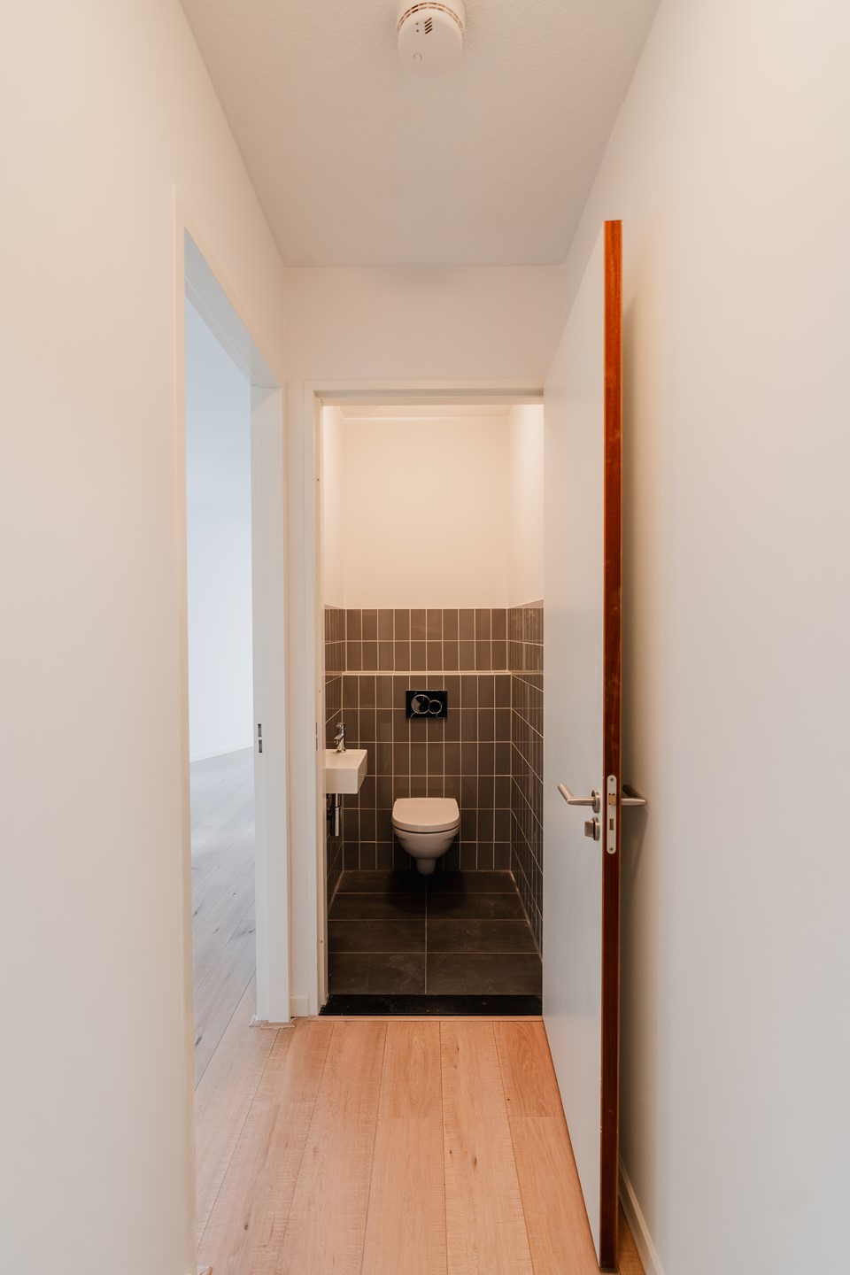 Via de gemeenschappelijke entree bereikt u met de lift of trap de woning. De hal biedt toegang tot een separate toiletruimte en leidt naar de lichte woonkamer met open keuken. De keuken is uitgevoerd en voorzien van hoogwaardige inbouwapparatuur, waaronder een inductiekookplaat, combi-oven/magnetron, koelkast met vriesvak en vaatwasser. Vanuit de woonkamer geven openslaande deuren toegang tot de beschutte loggia van circa 5 m².