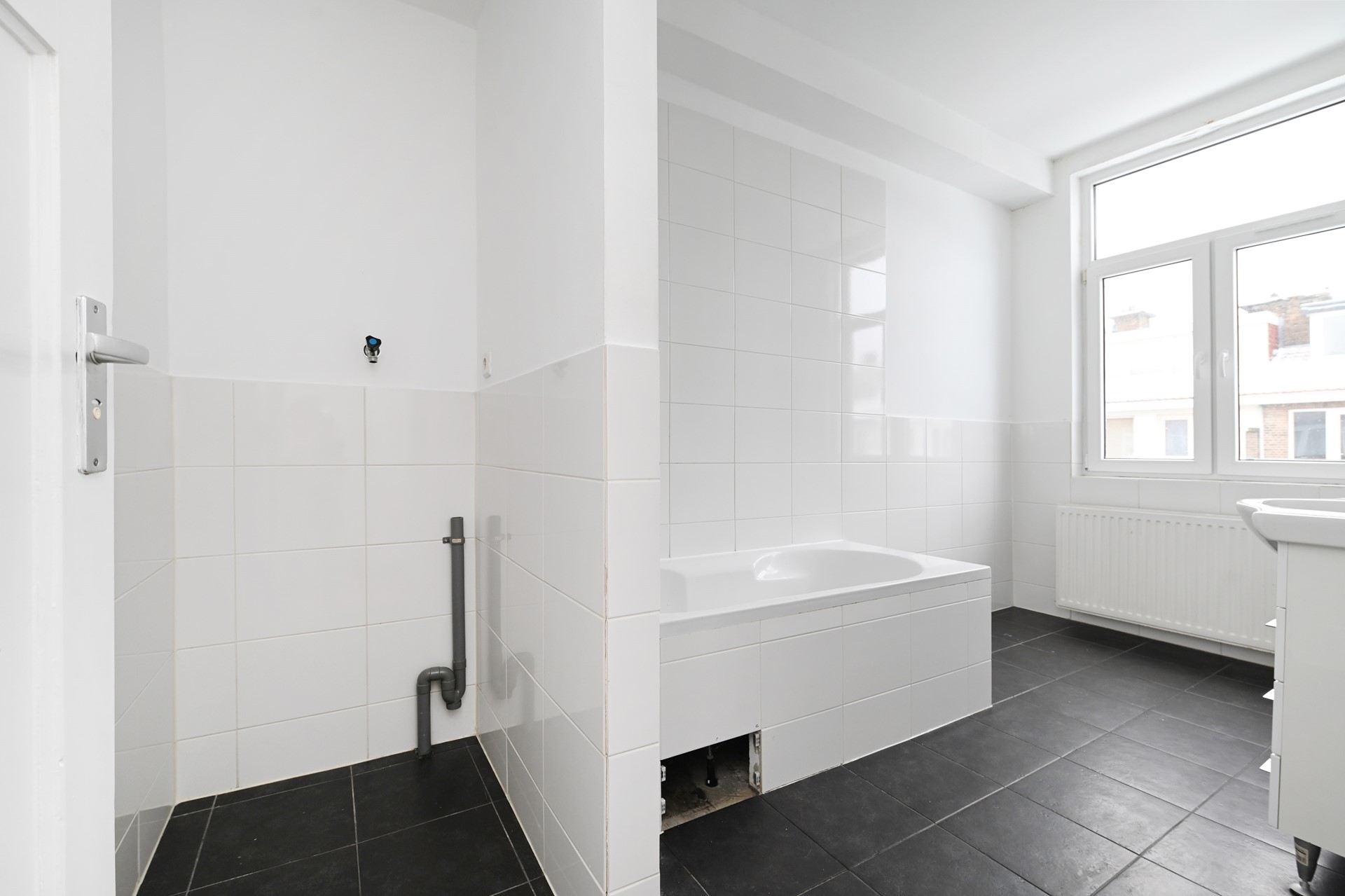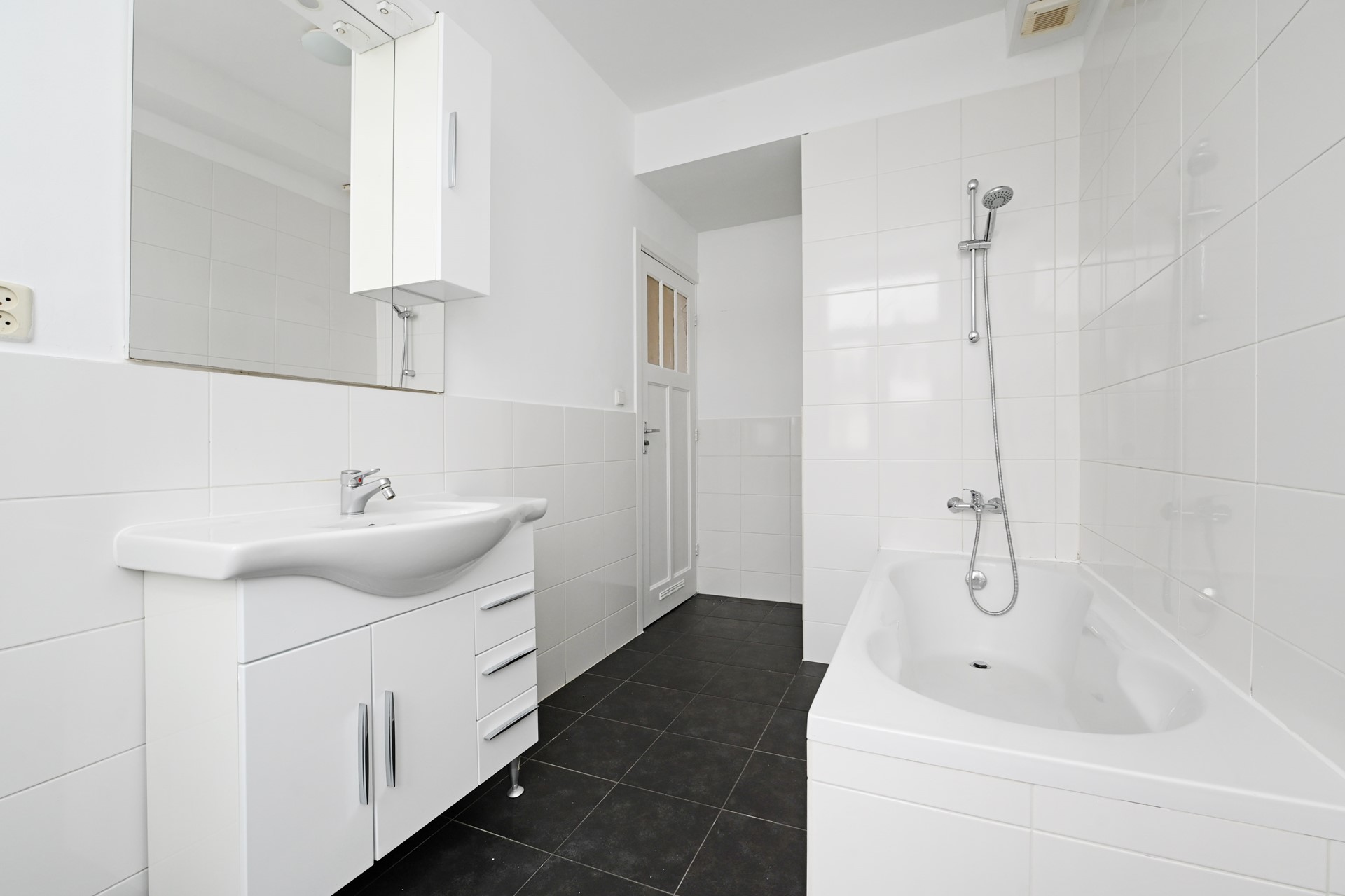 Badkamer is voorzien van een bad met douche, wasmeubel en plek voor de wasmachine.